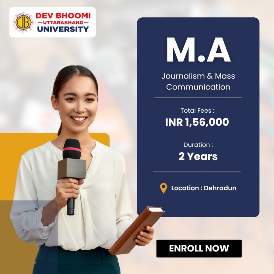 Highlights The M.A. in Journalism and Mass Communication at DBUU is a two-year, full-time postgraduate program split into four semesters. It equips students with a blend of theoretical knowledge and hands-on skills through portfolio creation, media projects, and research assignments. The curriculum covers journalism’s role in society, news gathering, digital trends, and social issues. With active participation in multimedia activities, students develop strong communication and reporting abilities. Dedicated placement support prepares graduates for successful careers in the media industry.