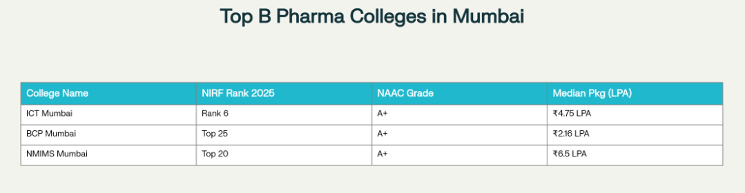 B Pharma colleges in Mumbai have consistently achieved impressive national rankings in the NIRF (National Institutional Ranking Framework) 2025 . Institute of Chemical Technology (ICT Mumbai) secured Rank 6 with a score of 74.77 , making it Maharashtra's highest-ranked pharmacy institution. Bombay College of Pharmacy (BCP Mumbai) features prominently in the NIRF Pharmacy rankings and holds NAAC A+ accreditation with 3.48 CGPA . NMIMS Mumbai's Shobhaben Pratapbhai Patel School of Pharmacy ranks among India's top 20 pharmacy colleges with strong research output and industry connections. The NIRF evaluation considers parameters including teaching-learning resources (TLR), research and professional practice (RPC), graduation outcomes (GO), outreach and inclusivity (OI), and perception. Mumbai pharmacy colleges benefit from their proximity to pharmaceutical hubs, research institutions, and 200+ pharma companies in Maharashtra. Rankings validate their quality education, placement records (median packages ₹2.16-4.75 LPA), research contributions, and NBA/PCI approvals.