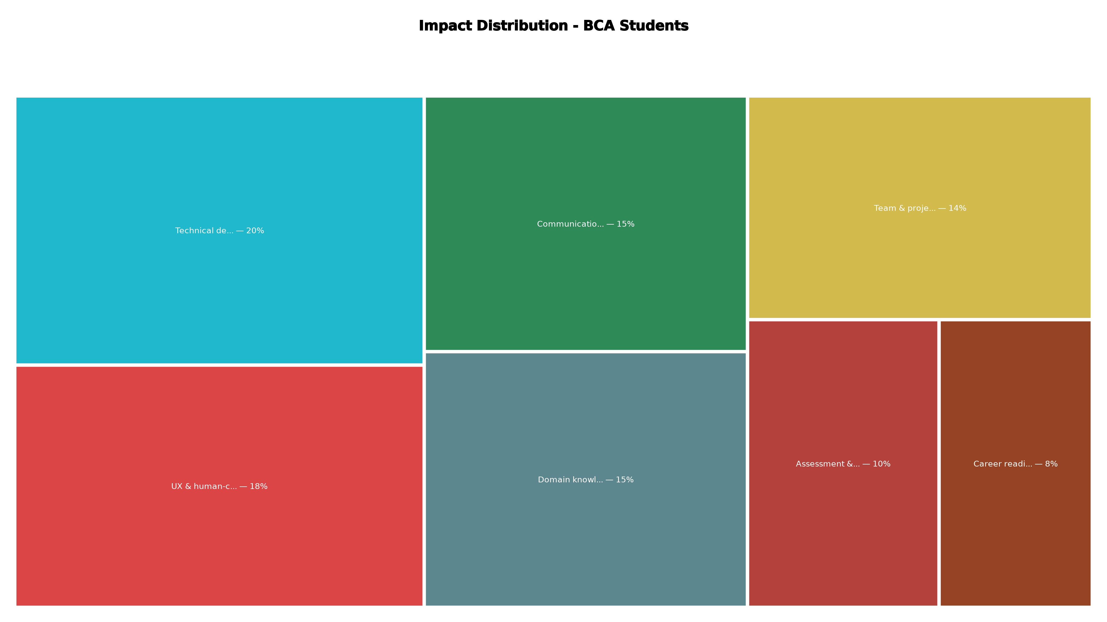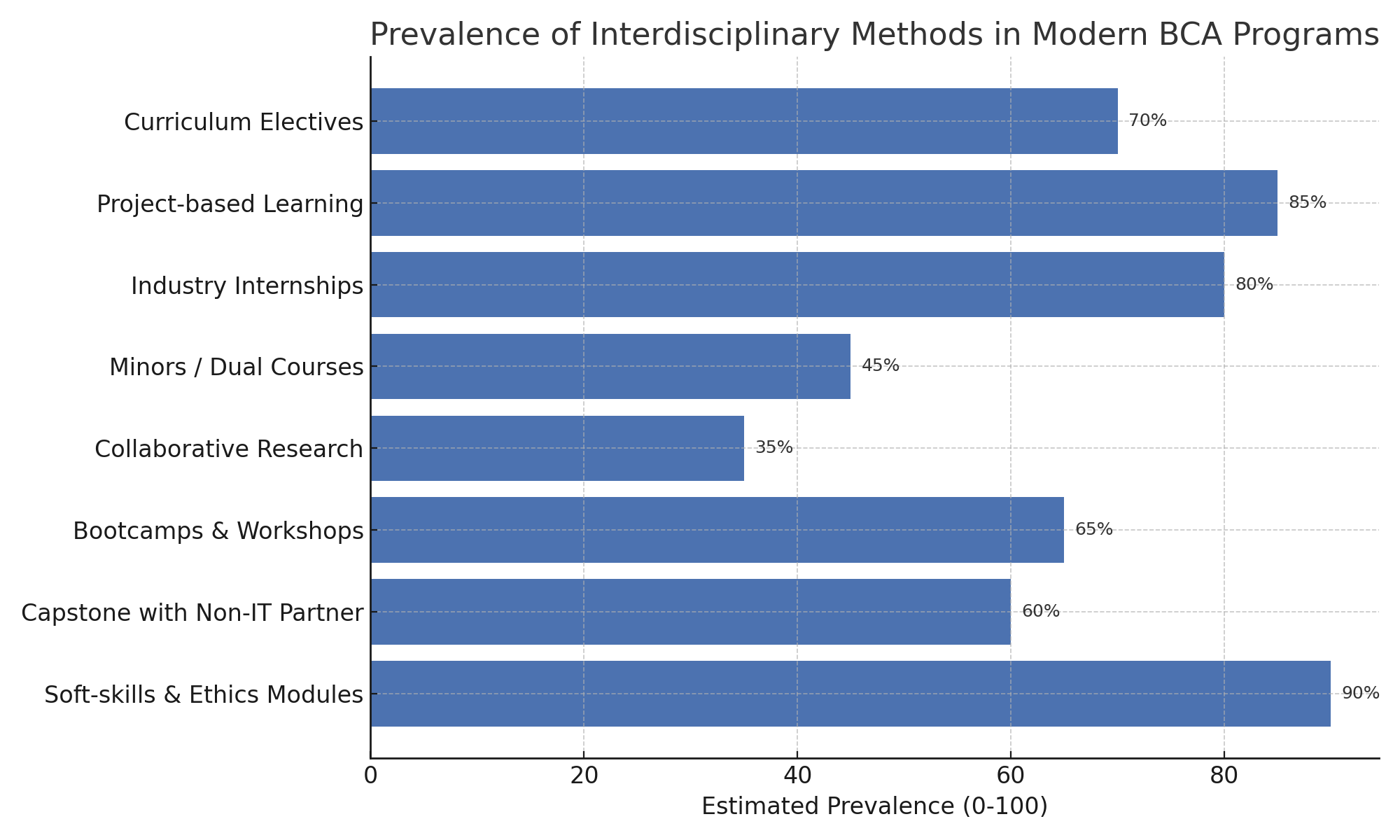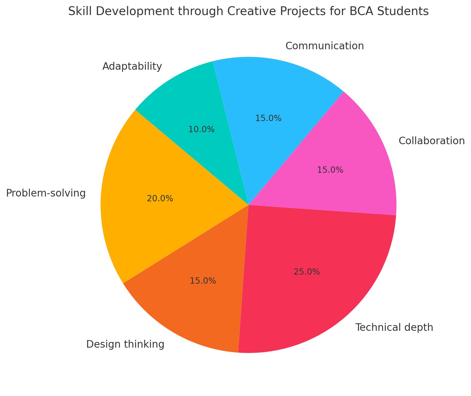 Interdisciplinary collaboration in BCA programs enhances students’ technical depth (20%), communication (15%), UX design (18%), domain knowledge (15%), teamwork (14%), feedback-driven learning (10%), and career readiness (8%), creating well-rounded, industry-ready graduates.