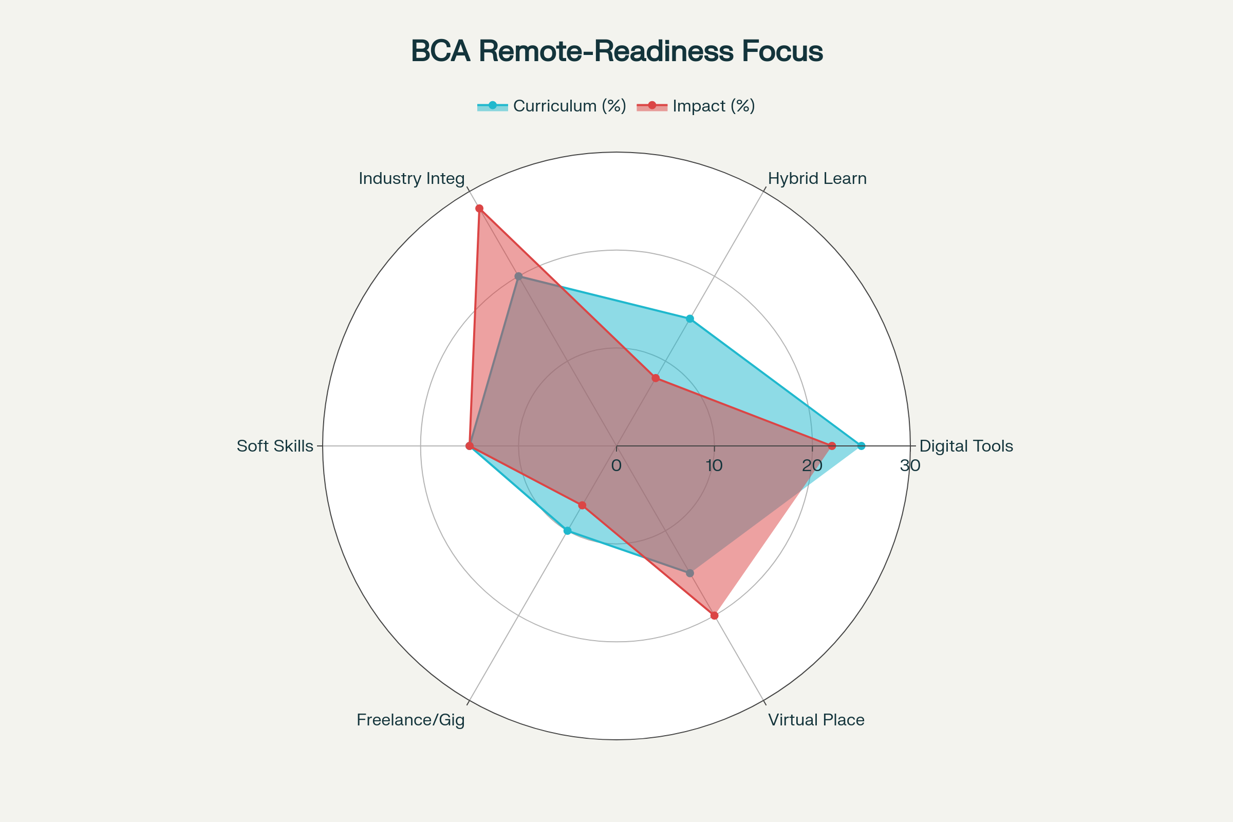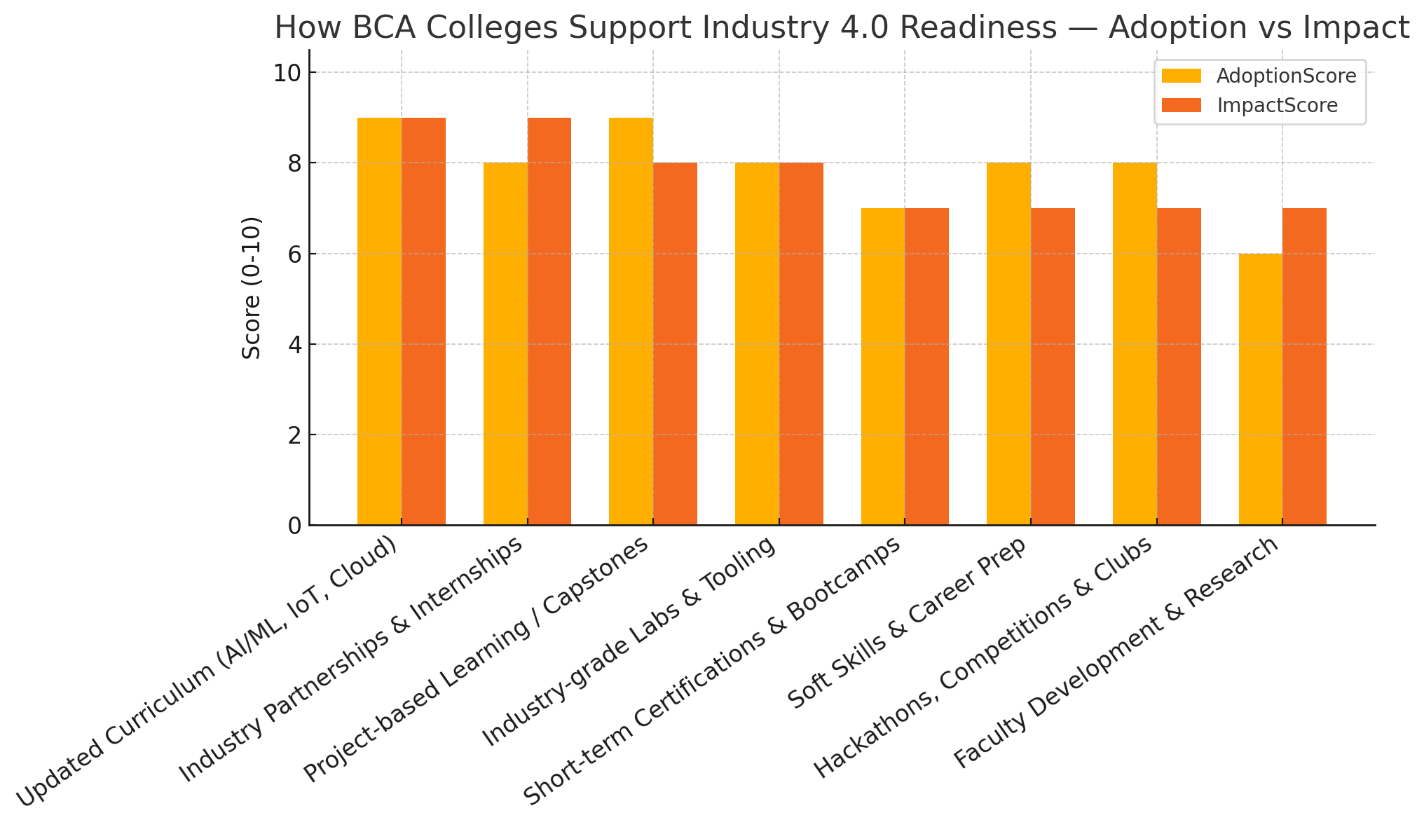BCA colleges adapt to Industry 4.0 through a mix of curriculum changes, hands-on projects, industry ties, labs and short bootcamps. The highest-rated levers for both adoption and real student impact are: updated curriculum (AI/ML, IoT, Cloud), project-based capstones, and industry partnerships/internships. Faculty development, while crucial, often scores slightly lower in adoption — improving it yields multiplied benefits because trained faculty scale the other initiatives. Soft skills, hackathons and certifications are widely used to translate technical readiness into employability. Initiative Short Description AdoptionScore ImpactScore Updated Curriculum (AI/ML, IoT, Cloud) Curriculum modules added on AI, ML, IoT, Cloud and Data Analytics with hands-on labs and projects. 9 9 Industry Partnerships & Internships Formal tie-ups with local tech firms for internships, live projects and guest lectures. 8 9 Project-based Learning / Capstones Mandatory capstone projects addressing real-world problems using modern tech stacks. 9 8 Industry-grade Labs & Tooling Labs for IoT, ML, Cloud credits, virtualization, Docker, Git and CI/CD practice. 8 8 Short-term Certifications & Bootcamps College-run or partner bootcamps for specific in-demand skills and certifications. 7 7 Soft Skills & Career Prep Resume-building, mock interviews, domain communication and teamwork training. 8 7 Hackathons, Competitions & Clubs Student-run clubs, hackathons and coding competitions to foster innovation. 8 7 Faculty Development & Research Continuous upskilling of faculty, small research projects and industry sabbaticals. 6 7