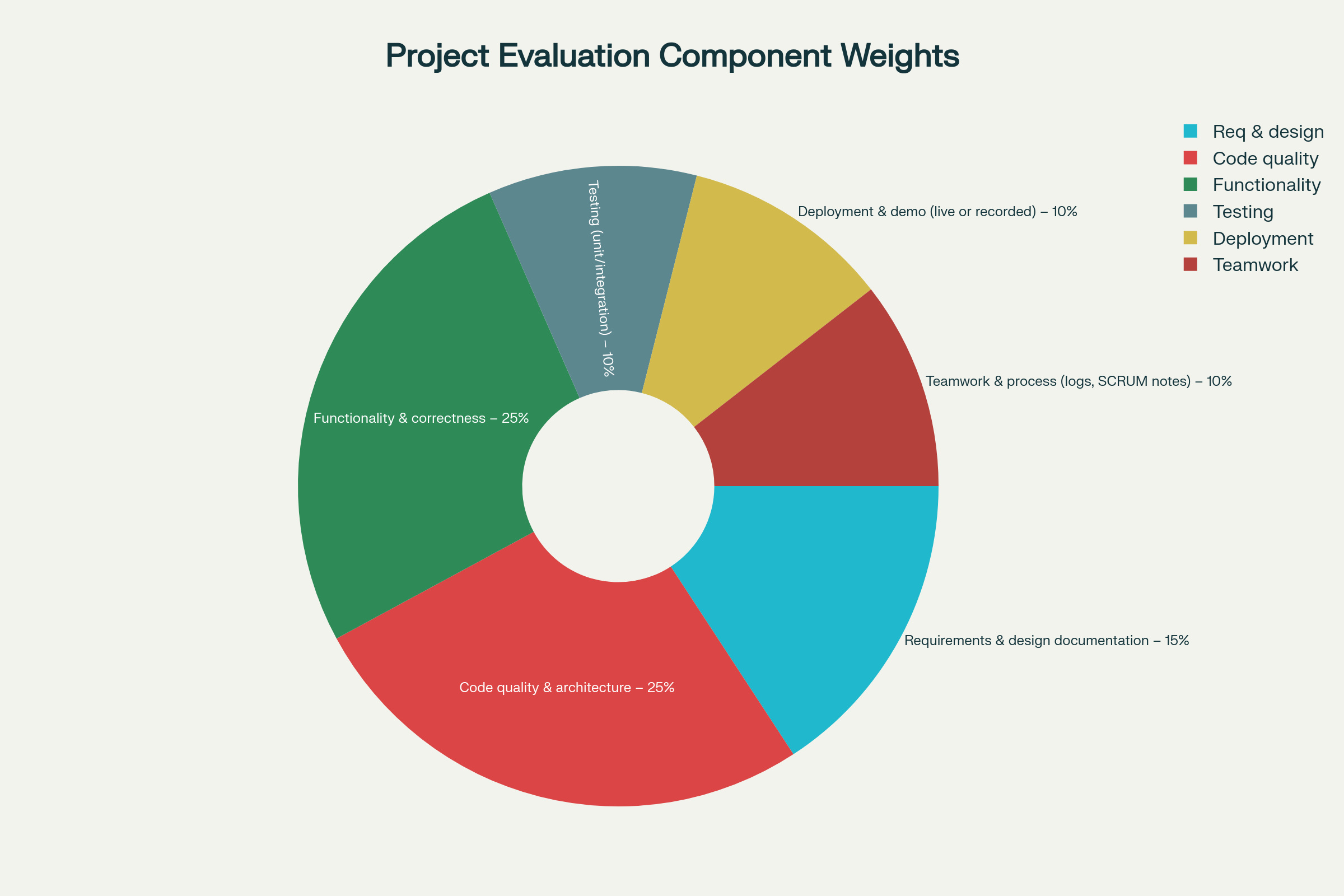 Component Weight (%) Requirements & design documentation 15% Code quality & architecture 25% Functionality & correctness 25% Testing (unit/integration) 10% Deployment & demo (live or recorded) 10% Teamwork & process (logs, SCRUM notes) 10% Total 100%