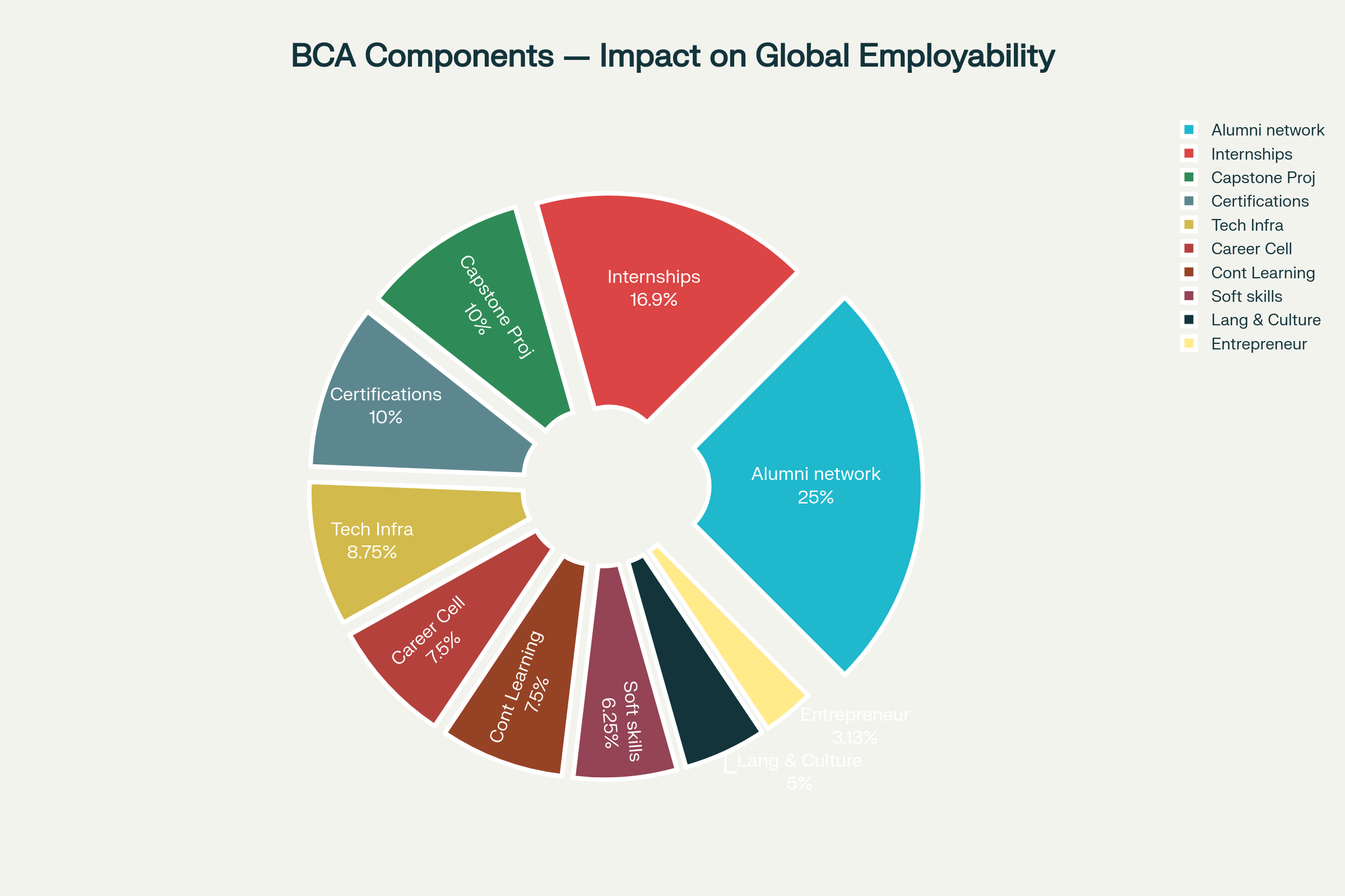 Component What top BCA colleges do Direct benefit to global employability Estimated measurable outcome (illustrative) Curriculum (projects) Mandatory capstone + industry projects every year Graduates show applied skills, shorten on-boarding time +40% faster interview-to-hire confidence in technical rounds Internships 6–12 week internships with product teams Real product exposure, references for recruiters 60–75% of students acquire work-ready skills Certifications Offer test-prep & subsidy for certs Verifiable skill badges for recruiters abroad 30–50% higher callback in screening stages Placements & Career Cell Mock interviews, company connects, alumni hiring Targeted job matches, international openings 20–40% of placed students get offers from firms with global operations Soft skills Technical writing, presentations, group projects Better remote collaboration, client communication Interview pass rate improved by ~25% Tech infra Cloud lab, Git servers, CI/CD access Knows deployment & collaboration tools used globally Project deployability increases hiring interest by ~35% Alumni Network Alumni mentors & referal panels Referrals to overseas roles, hiring insight 2x likelihood of getting recruiter intro vs no alumni support Entrepreneurship support Incubators, seed mentorship Product mindset, leadership roles in global startups 10–15% of students move to product/lead roles faster Language & cultural prep Business English, global etiquette workshops Reduced cultural friction in interviews & work Onboarding satisfaction up by ~20% Continuous learning Access to MOOCs, paid portals Keeps skills updated for evolving global needs Long-term employability improved (est.) 30%