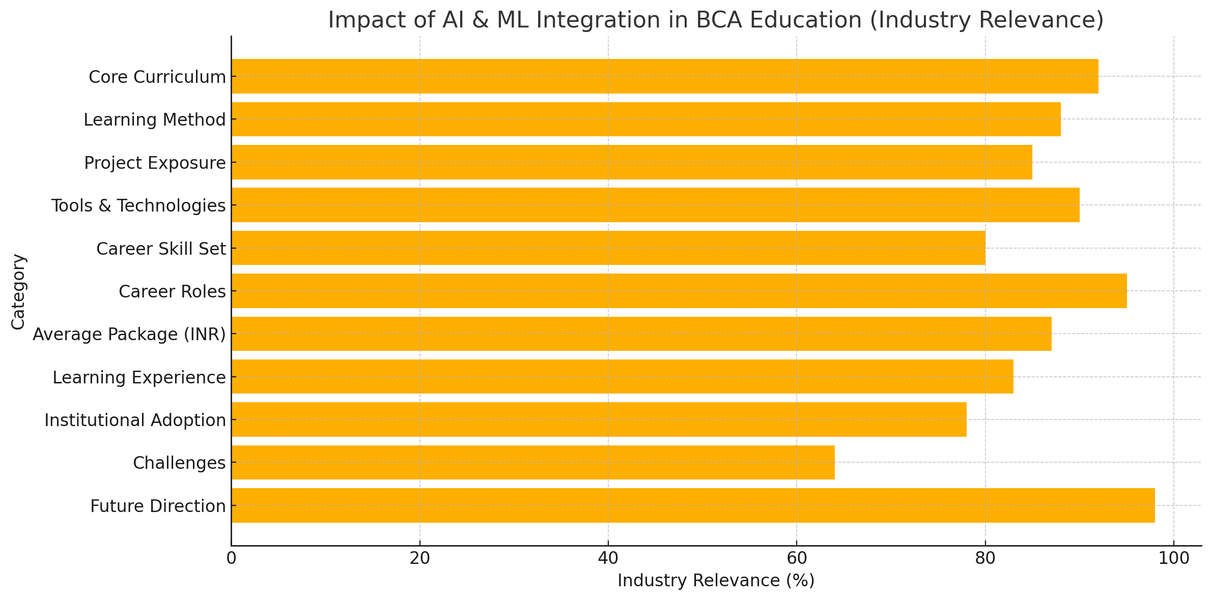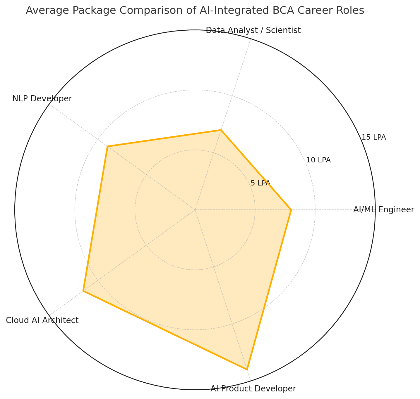 Category Traditional BCA Focus AI-Integrated BCA (Modern Approach) Impact / Outcome Industry Relevance (%) Core Curriculum C, C++, Java, DBMS, OS, Networking Python, TensorFlow, PyTorch, AI & ML specialization from 2nd year Curriculum modernized for real-world intelligence systems 92% Learning Method Theoretical modules and written exams Practical labs simulating AI systems, AutoML projects, data-driven learning Students develop analytical and research-oriented problem-solving 88% Project Exposure Static applications and mini software tools Chatbots (NLP), Image classification (CNNs), Predictive healthcare models, E-commerce recommendation systems Real-world AI model development with hands-on implementation 85% Tools & Technologies IDEs, SQL, JavaFX TensorFlow, PyTorch, Google AI, OpenAI APIs, Cloud AI platforms Industry-ready tool familiarity; smooth transition to corporate workflows 90% Career Skill Set Programming + DBMS fundamentals Data preprocessing, Model evaluation, AI ethics, Bias detection Strong cross-domain skillset bridging coding, ethics, and analytics 80% Career Roles Software Developer, Database Admin AI/ML Engineer, Data Scientist, NLP Developer, Cloud AI Architect, AI Product Developer 32–38% higher placement rates in AI-driven sectors 95% Average Package (INR) ₹3–5 LPA ₹6–18 LPA (role-dependent) Substantial increase in salary expectations due to niche specialization 87%