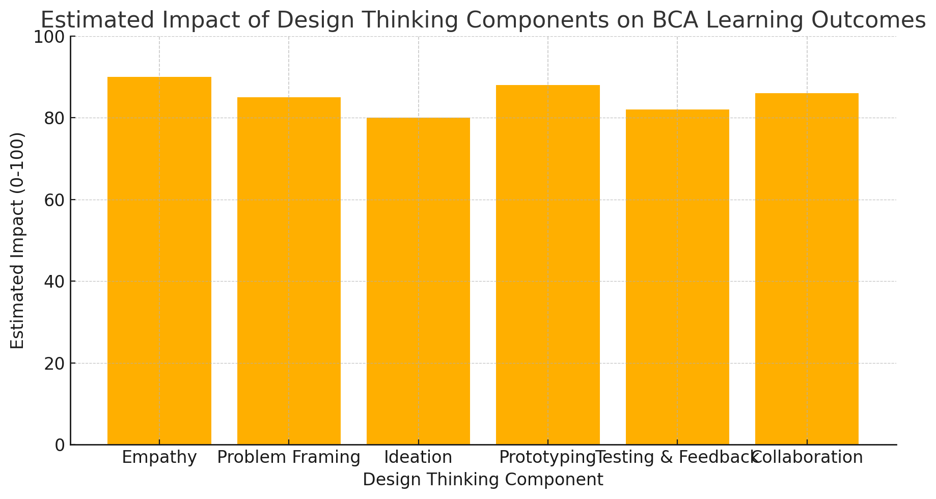 Component What it is How it helps a BCA student Example activities Estimated impact on learning outcomes (0-100) Empathy Understanding users' needs, context, and pain points. Shapes user-centered software and UX thinking; informs requirements. User interviews, empathy maps, shadowing target users (students, teachers). 90 Problem Framing Defining the real problem to solve (root cause). Prevents building the wrong feature; aligns development with value. Problem statements, 'How Might We' notes, root-cause analysis. 85 Ideation Generating many possible solutions without judgement. Boosts creative algorithms, feature design, and alternative approaches. Brainstorm sessions, crazy-8s, design sprints focused on app features. 80 Prototyping Building quick, low-fidelity versions of solutions. Enables rapid validation of UI/UX, flows, and technical feasibility. Wireframes, clickable mockups, minimum viable product prototypes. 88 Testing & Feedback Gathering reactions and iterating based on evidence. Improves quality through real-user validation and data-driven changes. Usability tests, A/B experiments, feedback surveys, analytic reviews. 82 Collaboration Working across disciplines to combine skills and perspectives. Mirrors real-world team workflows; builds communication and project skills. Paired programming, cross-functional project sprints, peer critiques. 86