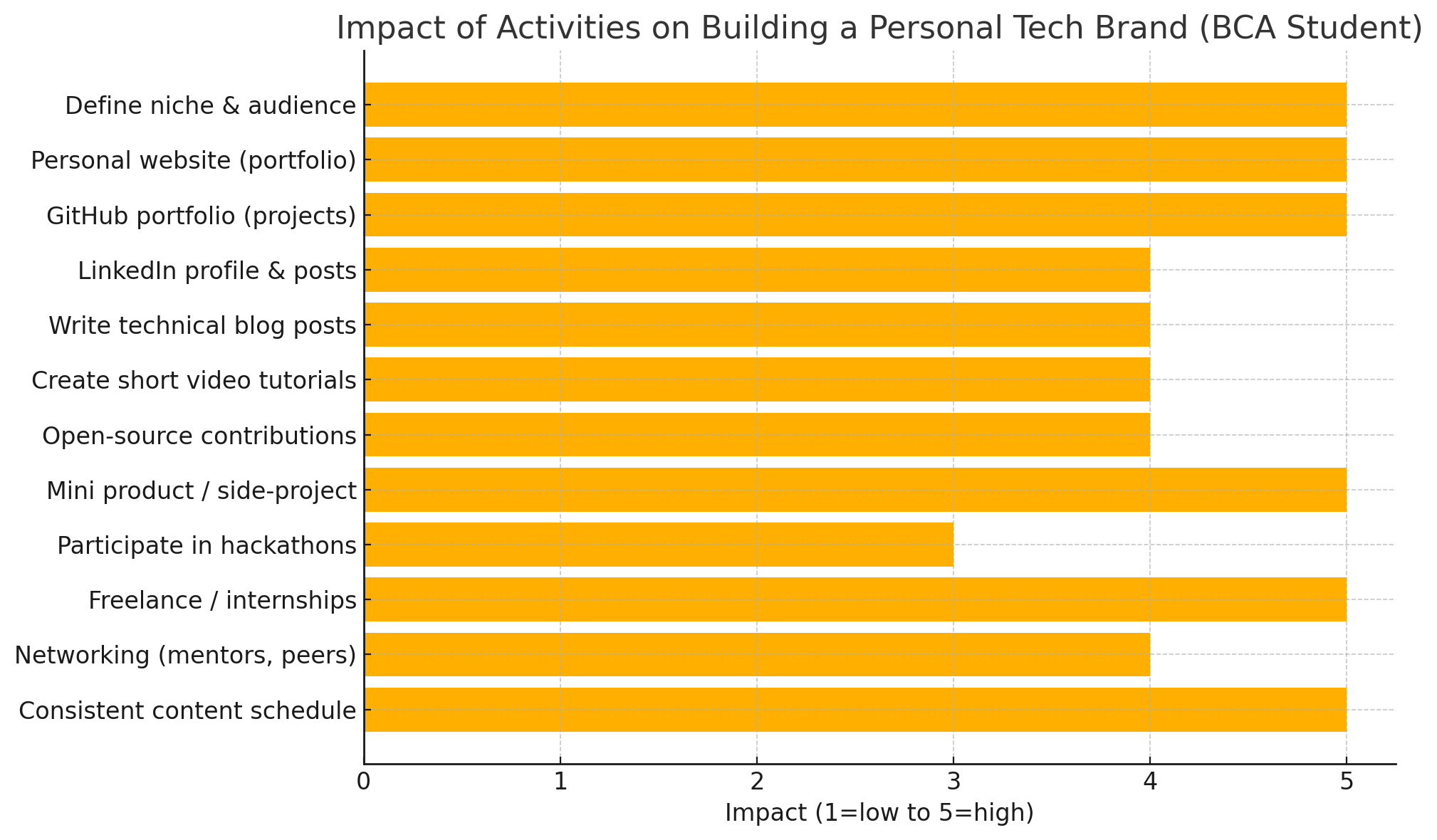 Action Weekly Hours (est) Difficulty (1=easy,5=hard) Impact (1=low,5=high) Quick Win (yes/no) Key Tools / Placements Define niche & audience 2 2 5 Yes Notion, Google Docs, mindmap Personal website (portfolio) 3 3 5 Yes GitHub Pages, Netlify, Vercel GitHub portfolio (projects) 4 3 5 Yes GitHub, README, projects LinkedIn profile & posts 2 2 4 Yes LinkedIn, Pulse Write technical blog posts 3 3 4 Yes Personal blog, Medium, Dev.to Create short video tutorials 2 3 4 Yes YouTube, Reels, Shorts Open-source contributions 2 4 4 No GitHub, GSoC-style contributions Mini product / side-project 5 4 5 No React/Vue app, Flask/Django API Participate in hackathons 1 4 3 Yes Local/college hackathons, Devpost Freelance / internships 4 4 5 No Internshala, freelancing sites, referrals Networking (mentors, peers) 1 2 4 Yes Twitter/X, Discord, College clubs Consistent content schedule 3 2 5 Yes Content calendar, Buffer/Hootsuite